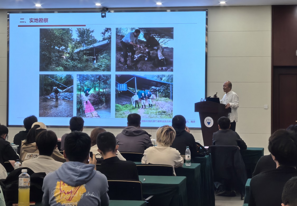 在受聘仪式前,仲德崑教授以《禁山古窑陈列馆原竹建筑实践及教学拓展》为题进行了学术讲座。报告详细介绍了浙江绍兴禁山古窑历史遗址保护项目的背景、考古研究、设计灵感及原竹结构搭建过程。该项目采用了当地盛产的原竹材料与钢结构的结合方式,成功地将传统建筑材料与现代建筑技术相融合。最后将这一案例的设计理念延伸至建筑学的实践与教学拓展。