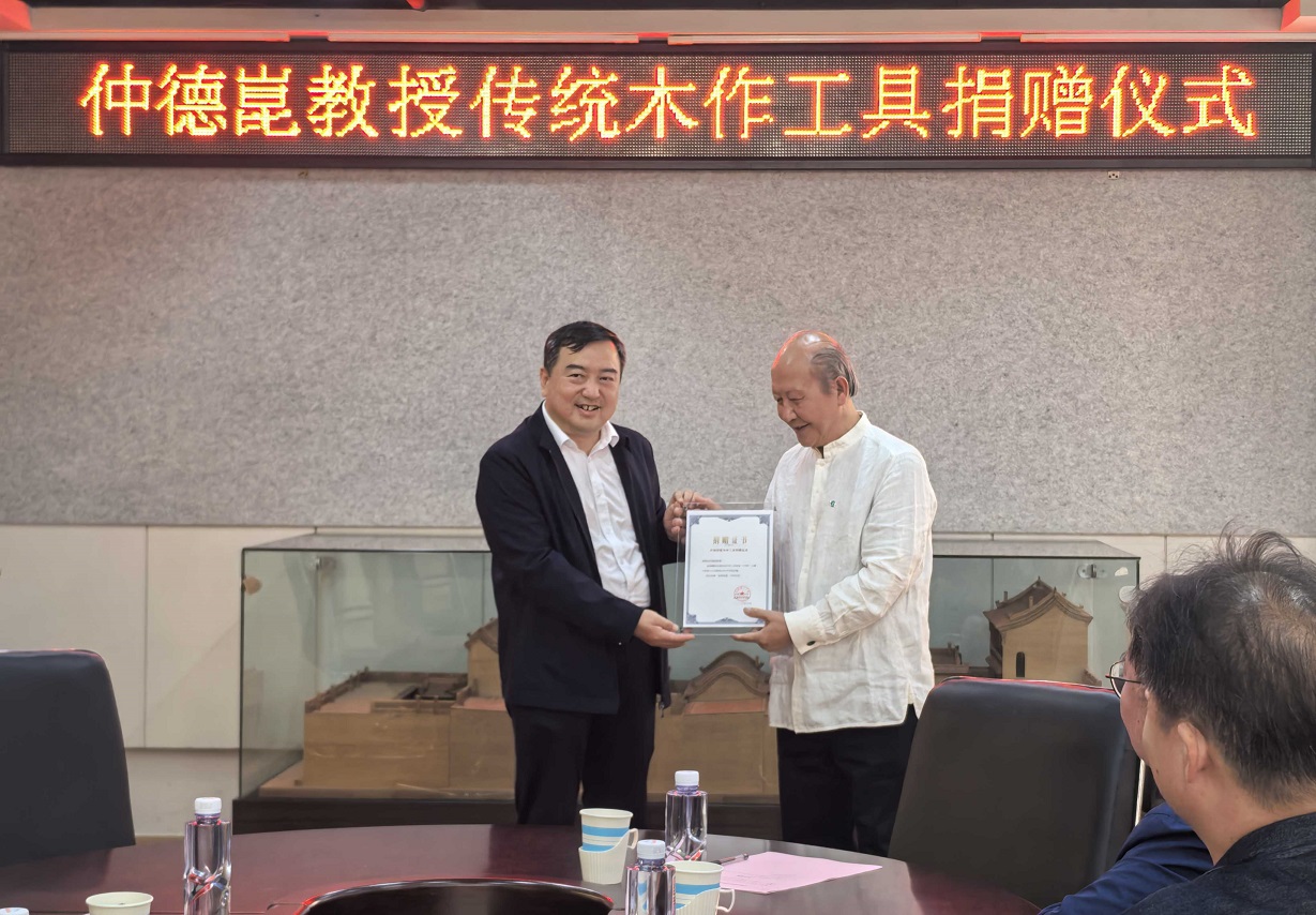 仲德崑教授是我国著名的建筑学者和建筑教育家,长期关注建筑相关工具与文物的收集与保护研究工作。此次,仲教授向我院捐赠了108件中国传统木作工具,其中包括尺、钻、锯、刨、凿等各类工具。在捐赠仪式上,仲德崑教授指出,中国传统建筑文化中,工具的重要性往往被忽视,许多博物馆中甚至难以找到相关的展示。同时强调,他捐赠这些工具的目标不仅仅是为了保存,更希望它们能在未来的教学中发挥作用,让学生们能够亲手体验并理解工匠精神的真正内涵。