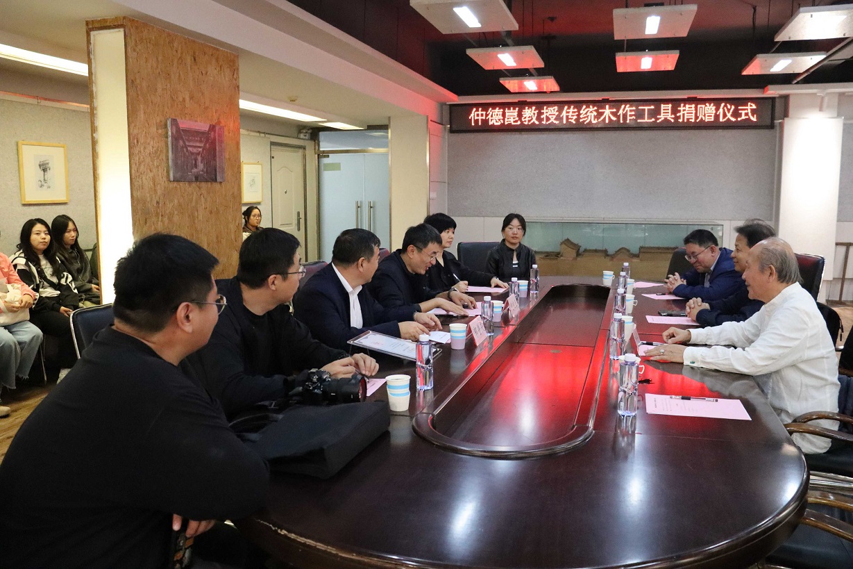 2025年9月24日下午,仲德崑教授中国传统木作工具捐赠仪式在建筑与艺术学院迎西校区四层东厅举行。出席仪式的有东南大学建筑学院仲德崑教授、东南大学建筑设计院副总规划师王新跃、太原理工大学建筑与艺术学院党委书记郭普庆、院长史文正、副院长康峰、建筑系副主任崔凯、李岚、建筑历史教研室主任李劲松以及学院教师代表。捐赠仪式由史文正院长主持,郭普庆书记向仲德崑教授颁发捐赠证书。