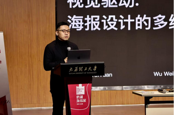 开幕式后,韩湛宁先生以“社会文化价值场景下的海报设计”为线索,系统梳理了其在重要活动中的策展与创作实践,深刻揭示了海报从概念到创意再到视觉成形的内在逻辑。吴炜晨老师的演讲则聚焦“国际视野下的海报叙事”,结合中国国际海报双年展、白金创意国际大学生平面设计大赛以及自己的项目实践等经典案例,剖析了海报如何从静态的二维表达走向动态、多维的视觉传播,拓展了设计的叙事边界。李英伟老师以“设计的时代印记”为贯穿,通过回顾其不同时期的代表性作品,生动诠释了海报作为社会文化映射的时代价值。三位专家的分享高屋建瓴,从观念、审美到技术演进,为在场师生勾勒出当代海报设计的清晰脉络与未来趋势,引发了强烈共鸣。