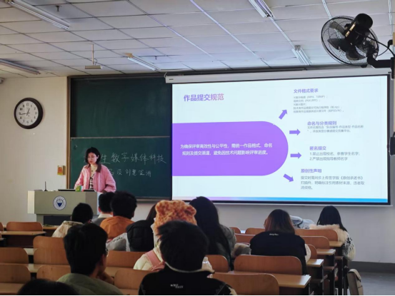 蔡英迪老师首先介绍了竞赛的整体概况,强调了该赛事在数字媒体领域的专业性与影响力,鼓励同学们以赛促学、以创促能。她详细解读了本届赛事的赛道设置与创作主题,明确了各赛道的具体要求,并围绕作品提交格式、团队组建方式及赛程时间节点等内容进行了系统说明。她还介绍了评审团构成与评分标准,帮助学生把握评审重点。现场展示了往届优秀作品,通过案例分析为学生提供了创作灵感和方向指引。