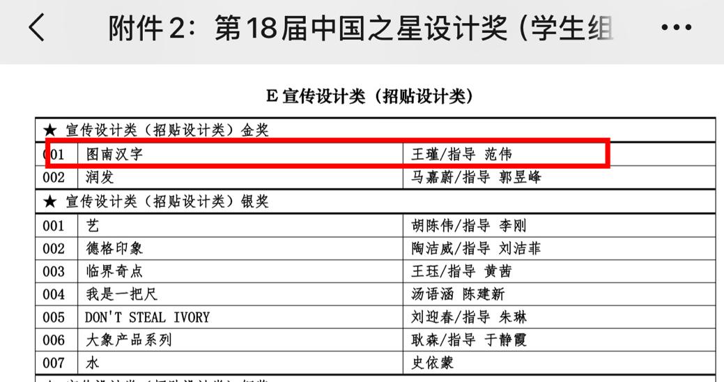 作品《图南汉字》由王瑾同学设计,范伟教授指导,以其独特的文化视角、创新的视觉语言与深刻的内涵表达,在激烈的竞争中赢得了评委的一致认可,最终斩获学生组最高奖项。范伟教授团队近年来在设计与文化传承交叉领域深耕不辍,此次团队研究生作品获奖,正是该方向教学与实践成果的一次精彩展现。