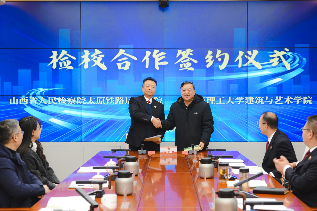 2026年1月27日上午,山西省人民检察院太原铁路运输分院与太原理工大学建筑与艺术学院在铁检分院会议室举行《校检合作协议书》签约仪式,正式建立战略合作关系。铁检分院党组书记、检察长郑黎明,我院郭普庆书记出席签约仪式,仪式由铁检分院党组成员、政治部主任白冰主持。